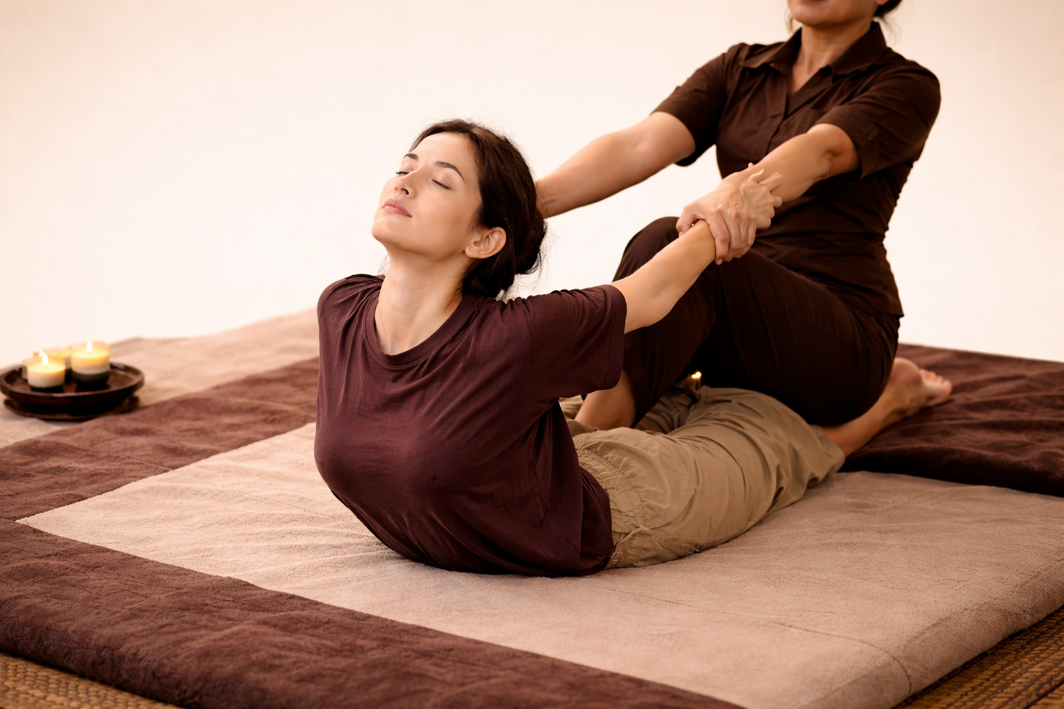 A woman receiving a massage while lying on a padded mat with candles nearby.